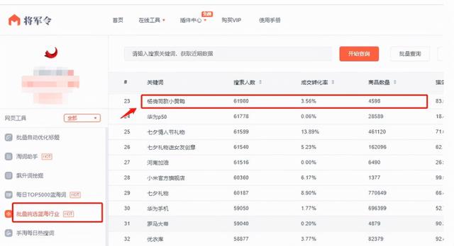 我们可以看到“蜥蜴吐舌头玩具”有差不多5千的搜索人数,但在线商品数量是5000,