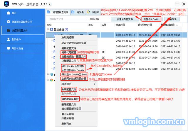 快捷编辑代理配置,批量编辑选中配置文件,Cookie导入导出,手动上传数据同步到服务器,配置文件分享,转移等功能如下图所示
