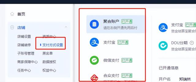 8、开通所有支付方式(点击支付方式设置,开通支付宝,微信,聚合账户,合众支付等支付方式) 不开通抖分期,提高回款效率