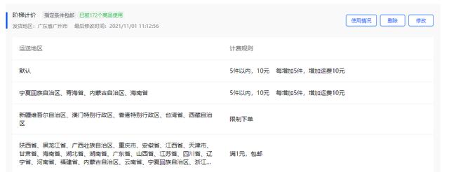 9、设置运费模版(港澳台,新疆,西藏不发////青海,内蒙,宁夏,海南,10元邮费),疫情区域设置限制下单,如图所示: