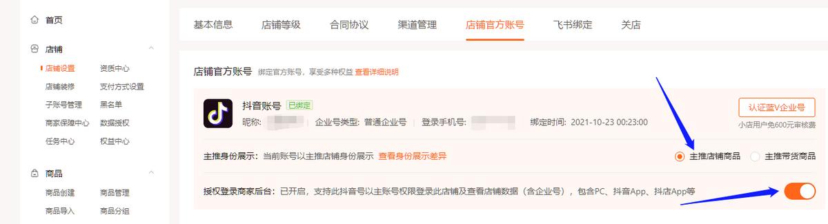 12、抖店后台绑定实名认证的抖音号,抖音号缴纳作者保证金500,点击店铺设置,店铺官方账号进行绑定,选择主推店铺商品