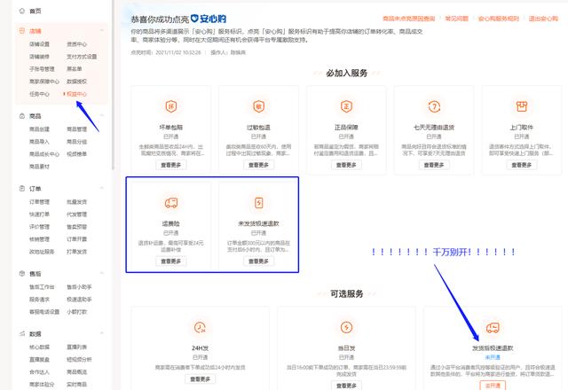 13、点亮安心购标签【开通 未发货极速退款,千万不要开通发货后极速退款】