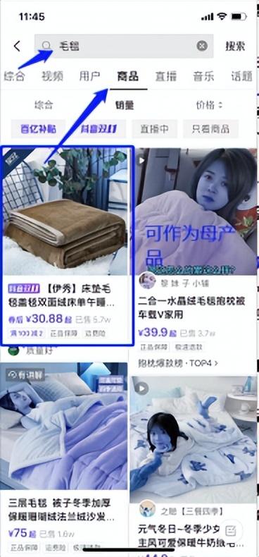 ②、通过抖音直接搜索,毛毯——点击商品,选择销量排序的,找到客单价比较低的产品,销量较高的母产品。
