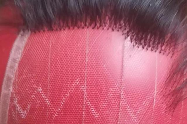 首先是把一张半圆形的网用图钉订在头模型上,然后拿着专门的钩针,左手拿一绺假发,右手拿针,先把钩针插进网眼里,再把头发挂在钩针上,最后把头发拉出来发个死结,以此类推,把网眼织完就算就完成了。
