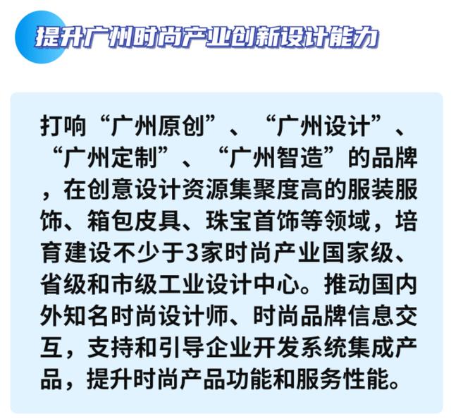 根据2020年制定的《打造时尚之都三年行动方案》,着力打响“广州原创、广州设计、广州定制、广州智造”的品牌