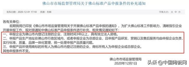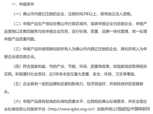 从《佛山市市场监督管理局关于开展2021年下半年佛山标准产品申报的通知》和《佛山市市场监督管理局关于佛山标准产品申报条件的补充通知》两个文件可知,佛山标准产品的申报条件如下(见图中文字):