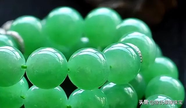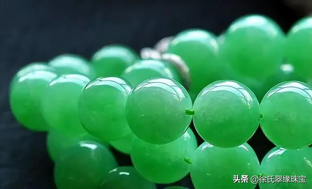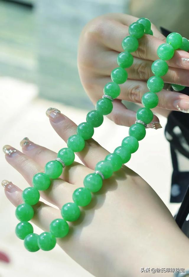 珠串颗粒硕大饱满,品相完美和谐,无论从哪个角度看都透出清澈如水的果绿色光辉。