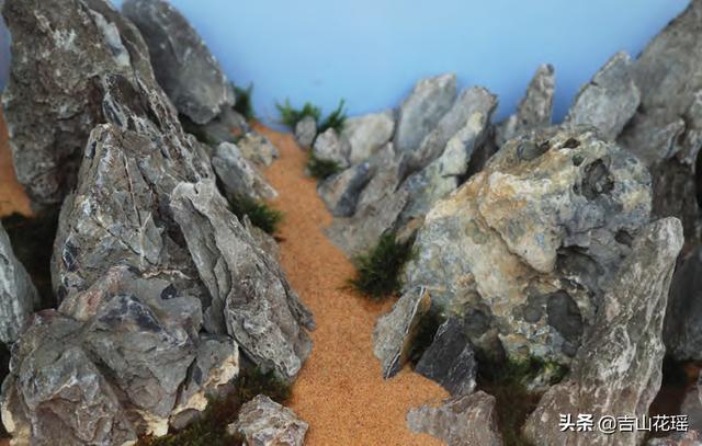 构建一条山间小路要符合透视原则,即小路越往后越狭小,两条边界线延长后最终相交于一个点,将坡高设置为缸体高度的1/2左右,配合制造出较深的景深。用铅笔简易画出石头大致形状和走向,若已有石头,可将其逐一摆开,按其形状安排位置,绘制细节图(见图1)。