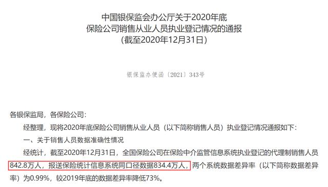 我们再看看最新的数据。在银保监会公布的《中国银保监会办公厅关于2020年底保险公司销售从业人员执业登记情况的通报(截至2020年12月31日)》中显示,中国保险从业人员842万(另外一个口径为834.4万)。