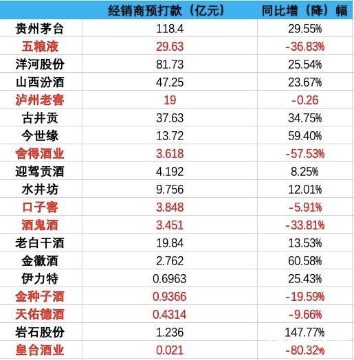 据南都湾财社记者了解,经销商预打款金额同比下降存在两大可能,第一是酒企自行放宽经销商的预打款考核,例如五粮液就从今年二季度起主动对经销商“松绑”;而另一种可能,则是相关酒企产品渠道库存过高,酒企难以再向渠道压货,只能以清库存为首要任务。