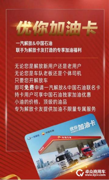 作为家喻户晓的解放“生态四剑客”之一,“优你加油卡”是一汽解放与中国石油联手为解放卡友打造的专享加油福利。只要卡友购车所在地开通了这一业务,就可以在指定解放经销商处免费开卡。该卡在全国多地享加油直降优惠,小油价格、大油品质,助力卡友节省运营成本。