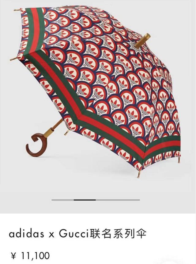 近日,奢侈品牌Gucci和运动品牌Adidas推出联名款雨伞,上面印满了Gucci和阿迪达斯的花纹,售价11100元。