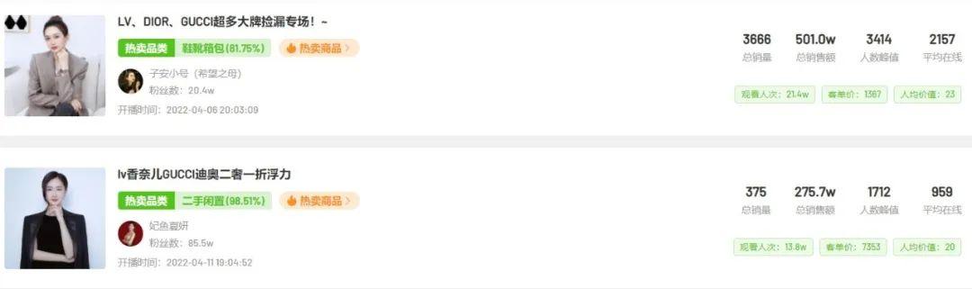 抖音则是妃鱼、胖虎、红布林等二手奢侈品平台及垂类奢侈品主播的重要经营阵地。妃鱼夏妍、妃鱼曼曼、胖虎高杨、子安等主播都曾带货LV、GUCCI、CHANEL等品牌。这些主播粉丝数量从10万到200万不等,但通过精准的用户建立起了不错的声量,单场直播销售额可达到百万以上。