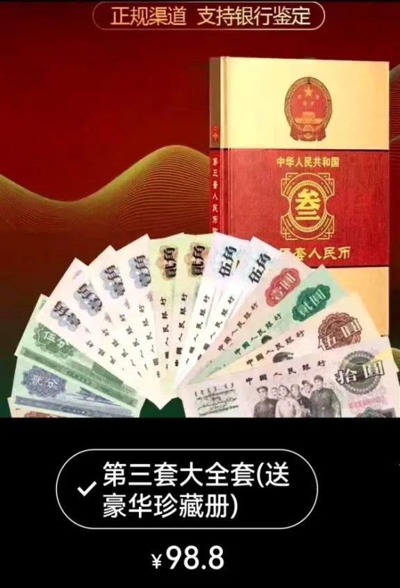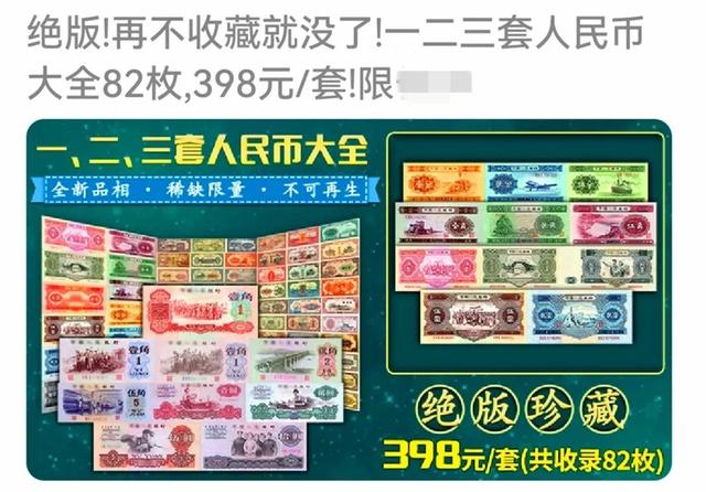 虽然第一二三套人民币已经先后退出流通停止使用,但作为一种不可再生的微型艺术品进入到了收藏领域,在古玩艺术品领域的钱币收藏门类中,目前全品相的第一二三套人民币(纸钞)的大全套市场参考价,分别为400万元、30万元、6万元左右。那么这家网店挂的一二三套人民币大全82枚398元/套,会是“全新品相·稀缺限量·不可再生”的真纸币吗?答案非常明白,这种一二三套人民币大全82枚398元/套,是仿一二三套人民币图案印刷的工艺品,所谓“稀缺限量·不可再生·绝版珍藏”是一种衬托营销的广告词,在现代纸币收藏中早就列入假冒仿造的印刷品,无任何收藏价值。