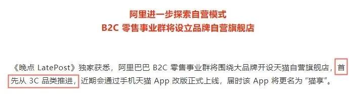 日前,据晚点团队报道,阿里巴巴 B2C 零售事业群将围绕大品牌开设“天猫自营旗舰店”,首先会从3C 品类推进,近期会通过手机“天猫 App”改版正式上线,届时该App 将更名为“猫享”。