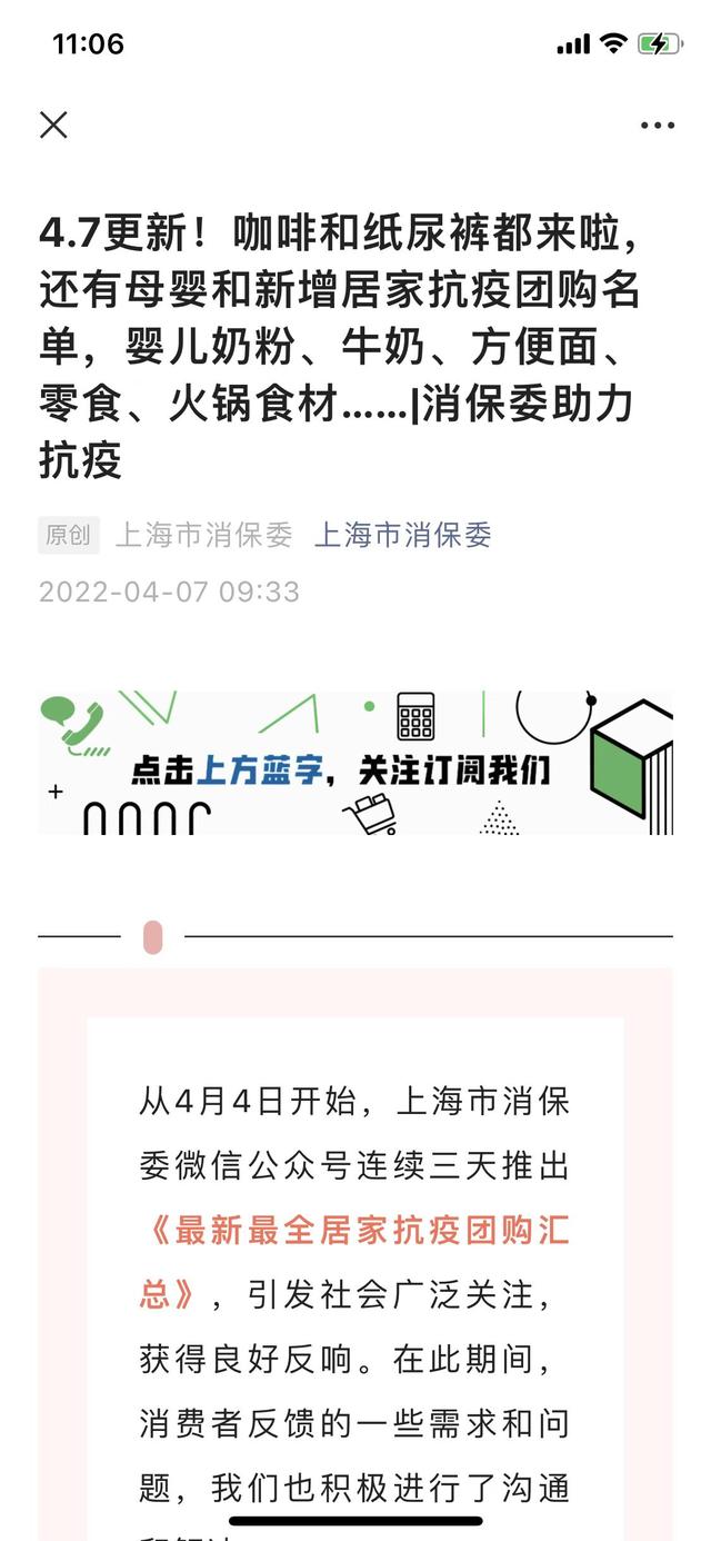 从4月3日开始,上海市消保委持续更新“居家抗疫团购汇总”,成为居民“买买买”的靠谱指南。截至4月8日,“团购汇总”已连续3天被“上海发布”公众微信号转发。很多网友在“上海市消保委”微信公众号留言,也“生生”将公众号开发成居家抗疫的编外“保供热线”。