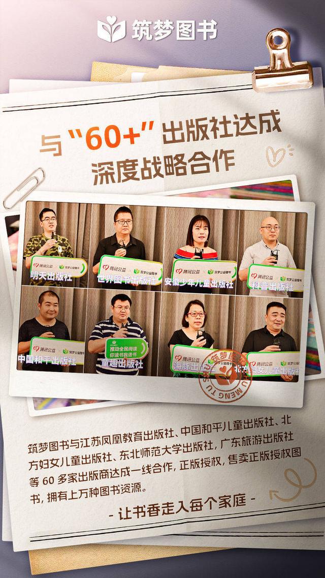 筑梦图书与江苏凤凰教育出版社、中国和平儿童出版社、北方妇女儿童出版社、东北师范大学出版社,广东旅游出版社等60多家出版商达成一线合作,正版授权,售卖正版授权图书,拥有上万种图书资源。
