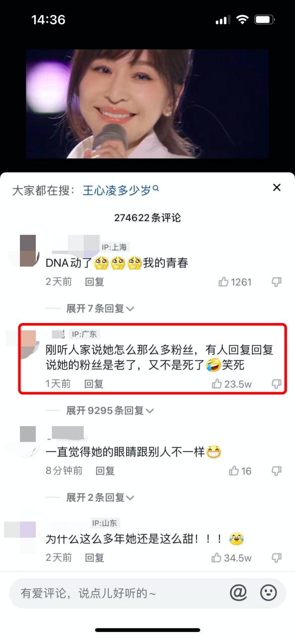 5月20日,王心凌在“乘风波浪的姐姐”综艺节目上唱了一首《爱你》。王心凌的歌被网友戏称“回忆杀”,有网友评论,“刚听人家说她怎么那么多粉丝,有人回复说‘她的粉丝是老了,又不是死了’。”