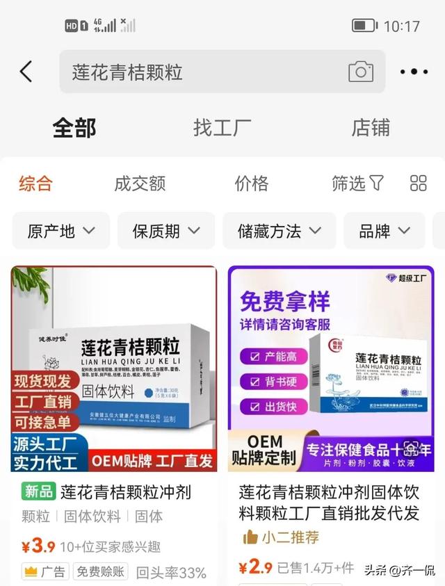 这些“莲花青桔颗粒”除了外包装和连花清瘟高度相似之外,分别来自不同的生产厂家。功效先不说,我试着找找商品的源头价格。