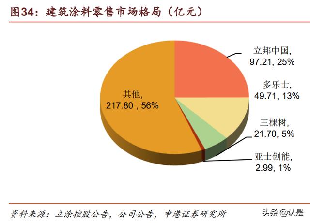 工程市场:经测算市场空间约为 490 亿元,市场格局高度分散。三棵树与立邦双寡 头引领市场,亚士创能紧随其后,多乐士近年来逐步收紧工程业务,占其总营收比 例不超过 20%,因此在工程市场份额并不高。(报告来源:未来智库)