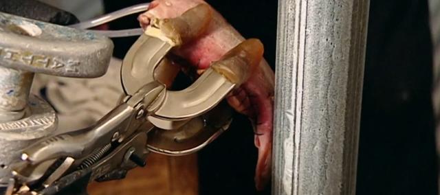 接下来托瑞用自己戴手套的手,进行纹理的实验,手套是光滑的,沾满唾液以后,接触金属杆,但是也没有被粘住,看来舌头的纹理也是一大关键,最后他们将金属杆换成了塑料杆,并降温到同一温度,然后用湿润的猪舌接触,依旧没有被粘住,由此看来三个条件缺一不可。