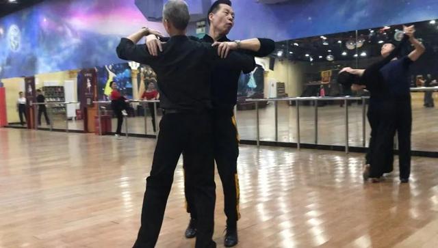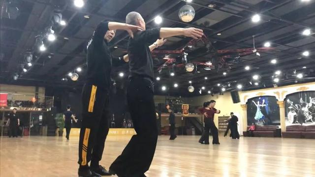不一会儿,这个大龄男男组合挺直了上半身,头各侧向一边,双臂架起来,手搭在对方的肩膀上。老师右脚退步,学生左脚前进,脚尖着地后落跟;右旋转至135度,老师横左,学生横右,左肩引领右倾斜,右肩引领左倾斜……他们起落起落,形成一个个抛物线。