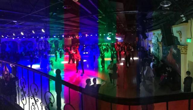 它的总面积约1400平米。在各色镭射灯下,不少中老年舞伴跳着交谊舞。舞台正前方,大屏幕滚动播放着华尔兹国际赛事的录像,电子琴、架子鼓、长号等乐器还在静候乐队成员。