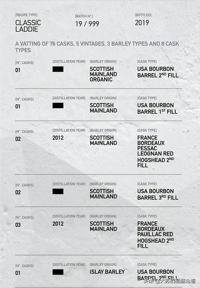 倡导酒款的信息透明是布赫拉迪挑战游戏规则的另一个方面。比如,经典莱迪,你可以在酒厂网站获得关于大麦产地、使用的橡木桶类型以及蒸馏年份等详细信息。