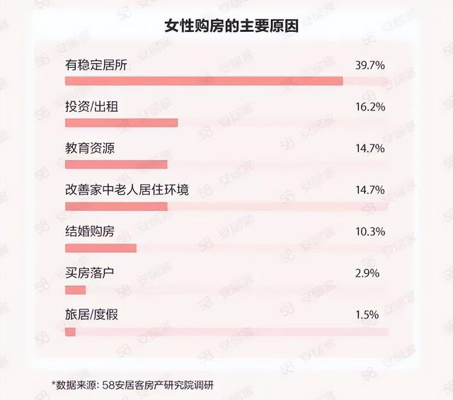报告称,39.7%的参与调研的女性表示是为了拥有稳定的居所,这一因素的占比超过投资/出租、教育资源、结婚购房等。总体来看,女性购房时越来越看重独立购房、房产证署名、购房决策权以及追求稳定居所,表明女性在购房中追寻实实在在的安全感,希望能得到一个属于自己的小天地。