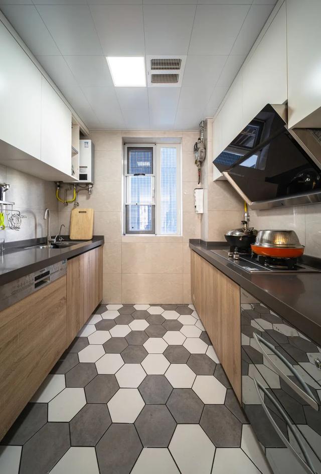橱柜采用了“双一字型”布局,拥有充足的操作台面和储物空间,两三个人同时下厨都不会感到拥挤。