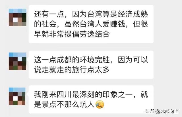 虽然台湾人爱赚钱,但很早就提倡劳逸结合了,而这与成都人 “ 活在当下 ” 的生活态度不谋而合。高老师直言:成都的环境完胜,因为可以说走就走的旅游点太多,而且四川的景区不怎么坑人,这一点很重要。