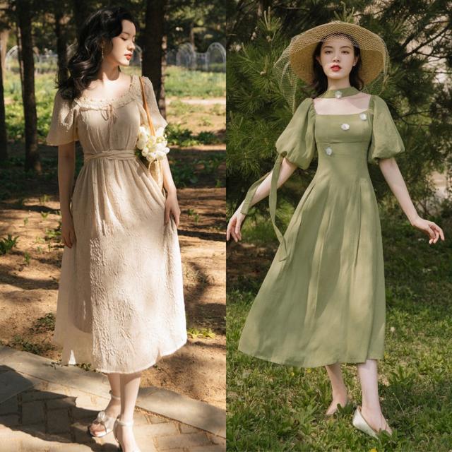 另外,下图(右图)中的这种选用了花朵样式的泡泡袖方领裙不仅可以满足你的遮肉显瘦需求,还能增添俏皮感,三四十岁的女人穿上身,减龄效果满分!