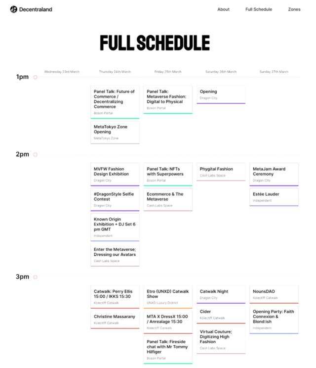 3月24日至27日,元宇宙平台Decentraland举办全球首届元宇宙时装周(Metaverse Fashion Week,以下简称“MVFW”)。此次活动是世界上目前规模最大的、完全数字化的时装周,已有70多个品牌、艺术家和设计师确认参加,包括雅诗兰黛、Etro(艾绰)、Tommy Hilfiger(汤米·希尔费格,)、Cavalli 和 IKKS 等主要品牌。(详见《华丽志》:全球首届元宇宙时装周3月24日举行,Tommy Hilfiger、雅诗兰黛等品牌参与)