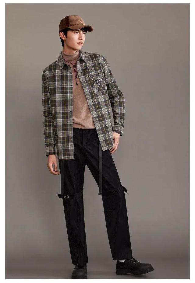 除了条纹之外,格子衬衫也是受到了很大的欢迎。下面的这一件其实是有一点偏公务感的,加上如果你的脖子不是很长的话,这样穿可能就会有一种短脖子星人的感觉,所以可以避开这样的搭配。
