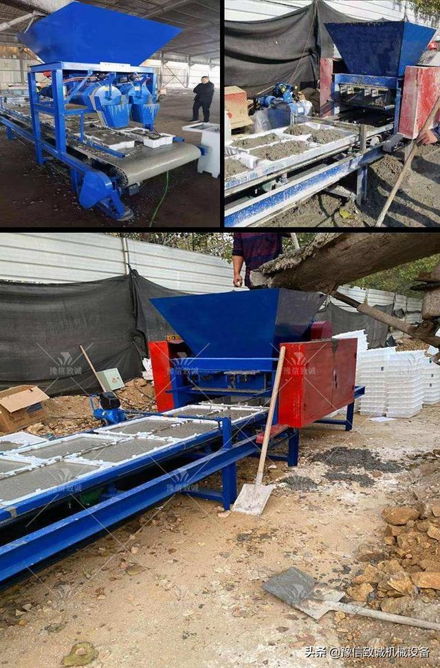 从图片上观察,最上面是机器的下料斗,不论是混凝土还是砂浆都可以使用,和料斗链接的部分是螺旋下料器,当混凝土(砂浆)由下料斗进入螺旋下料器,然后然后由螺旋下料器挤压出混凝土。螺旋下料器的开口通过气动开关配合,可以实现任意秒数自动开合。再往下是皮带输送带,模具盒放在输送带上,输送带下面有两个震动电机,模具盒在输送过程中即可完成混凝土的振捣工作。最后是电控箱,它可以控制螺旋下料器,皮带运输快慢和震动电机的开关。