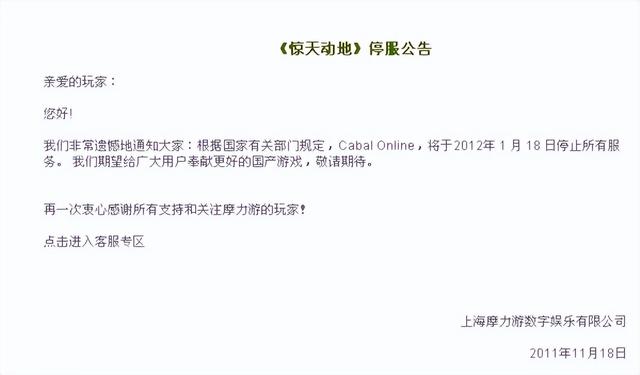 随后在2011年11月18日摩力游宣布,游戏将于2012年1月18日停止了所有服务。