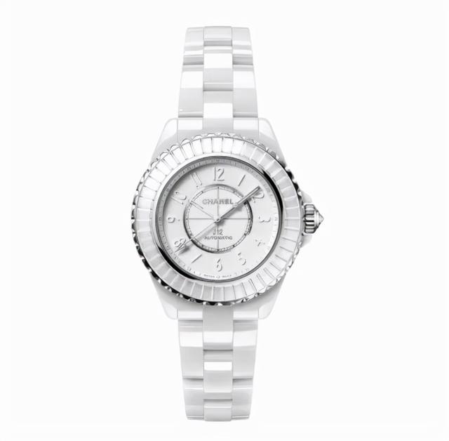 这是一只香奈儿J12系列H6785腕表,这只腕表搭载自动机械机芯,表壳和表带为白色精密陶瓷材质,表圈镶嵌长阶梯形切割白色漆面蓝宝石,表径33毫米,防水50米,参考价格86000元(以实际价格为准)。